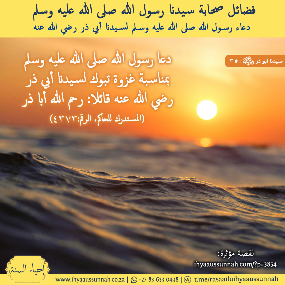 حتى قيل: يا رسول الله، تخلف أبو ذر وأبطأ به بعيره. فقال صلى الله عليه وسلم: دعوه، إن يك فيه خير فسيلحقه الله بكم، وإن يكن غير ذلك فقد أراحكم الله منه