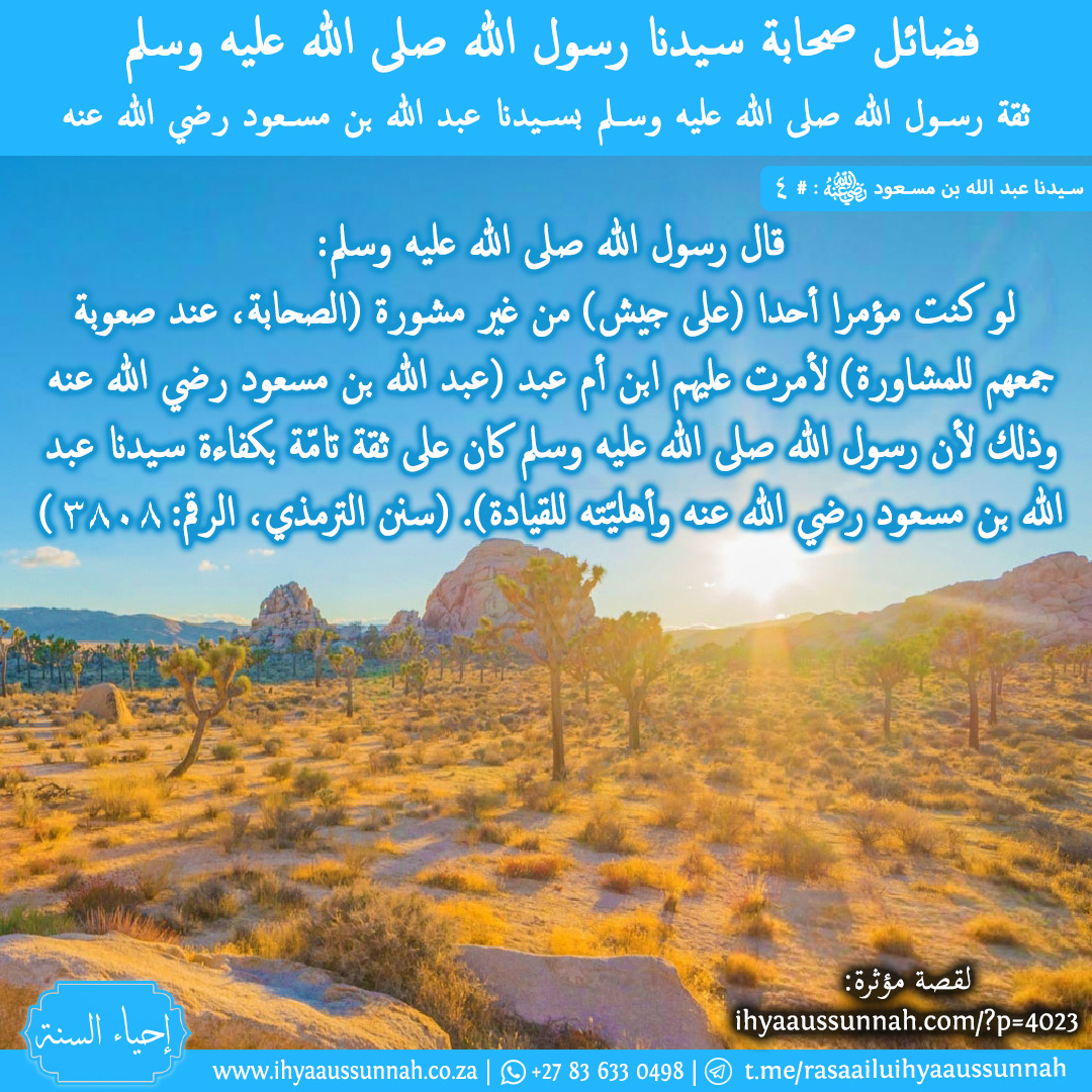 قال عبد الله بن مسعود: كنت مع رسول الله صلى الله عليه وسلم يوم حنين، فولى عنه الناس، وثبت معه ثمانون رجلا من المهاجرين والأنصار، فنكصنا على أقدامنا نحوا من ثمانين قدما، ولم نولهم الدبر (ولم نفرّ من المعركة)، وهم الذين أنزل الله عزوجل عليهم السكينة ، ورسول الله صلى الله عليه وسلم على بغلته يمضي قدما (يحرض دابته ليتقدم إلى العدو)، فحادت به بغلته، فمال عن السرج، فقلت له (وقد أخذني الخوف من أن يسقط رسول الله صلى الله عليه وسلم من السرج): ارتفع (ثبت نفسك على السرج) رفعك الله