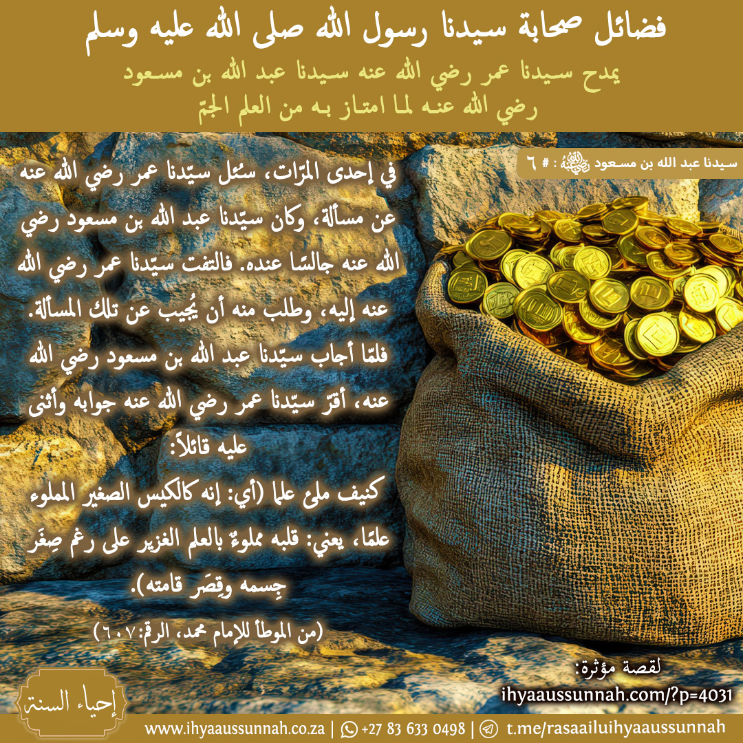فقال سيدنا عثمان رضي الله عنه: يكون لبناتك، قال سيدنا عبد الله بن مسعود رضي الله عنه: أتخشى على بناتي الفقر، إني أمرت بناتي أن يقرأن كل ليلة سورة الواقعة، إني سمعت رسول الله صلى الله عليه وسلم يقول: من قرأ الواقعة كل ليلة لم تصبه فاقه أبدا (من أسد الغابة ٣/٣٨١)